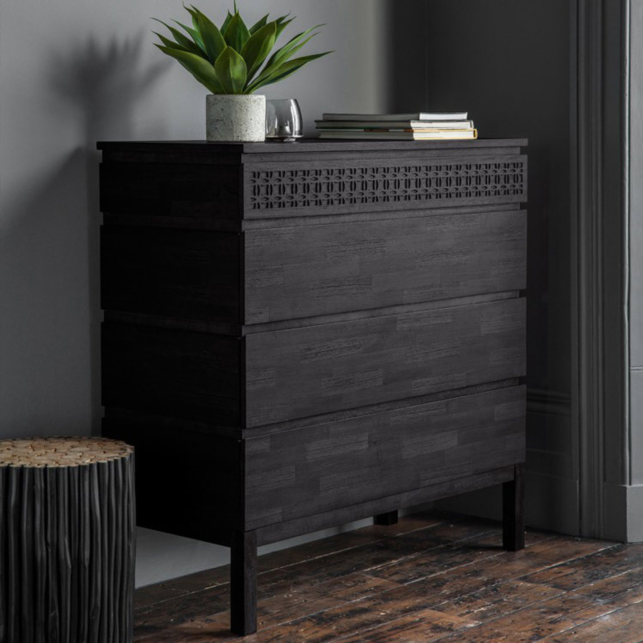 The Boho Black 4 Drawer Chest Boutique combines practical storage with a stunning design, featuring Mango solids and intricate blind fretwork, enhanced by a matt black charcoal finish for a striking look.