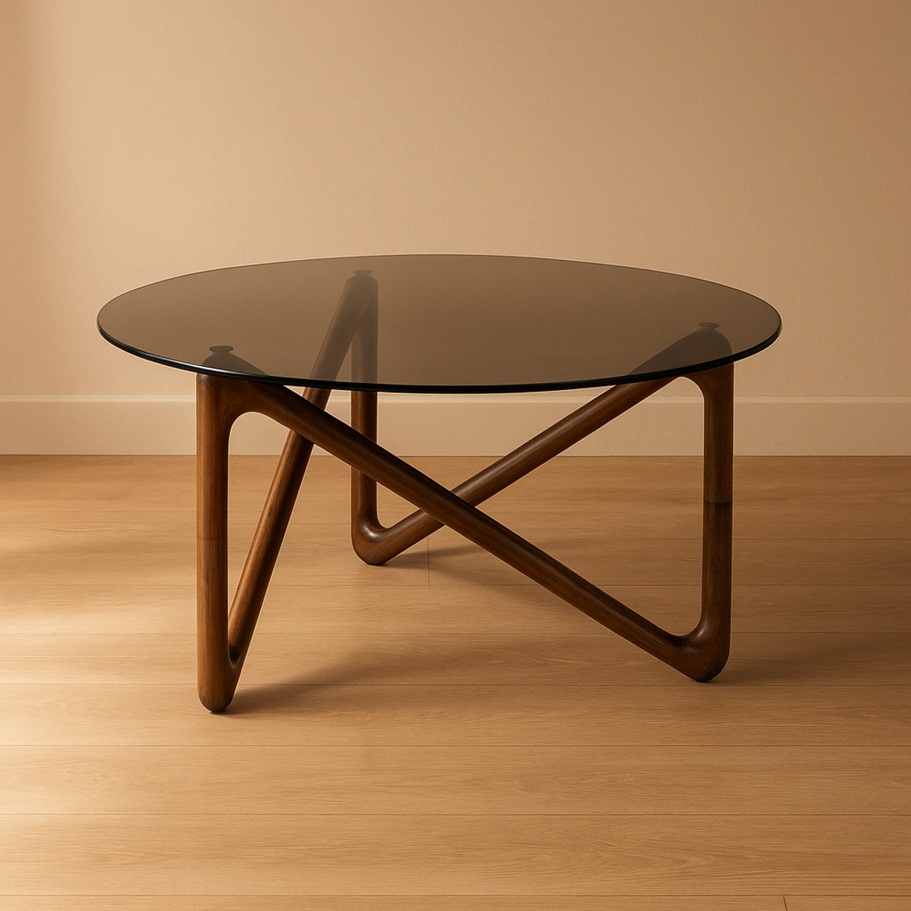 - Has a round smoked glass tabletop
