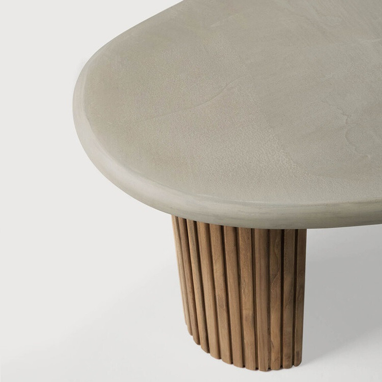 Playful, pebble shapes set on a beautiful, folded, base. Inspired by its popular indoor design, the Boomerang outdoor coffee table features a hand-finished concrete top, paired with a reclaimed solid teak base, a beautiful material mix provides durable practicality to both indoor and outdoor spaces. Configured with the two sizes together, or as a stand-alone, this well-proportioned design is sure to capture attention.