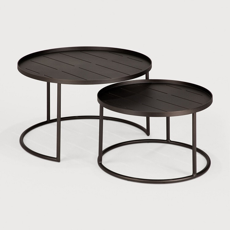 Outdoor tray tables extend versatility into open-air settings. Serving as side or coffee tables, their tops are designed to accommodate our range of indoor or outdoor trays, allowing you to combine functionality with personal expression. Used individually or as a set, they provide adaptable surfaces that enhance outdoor lounging and dining areas.
